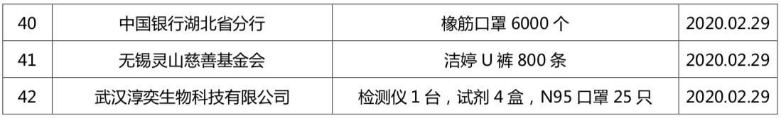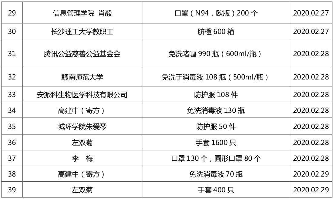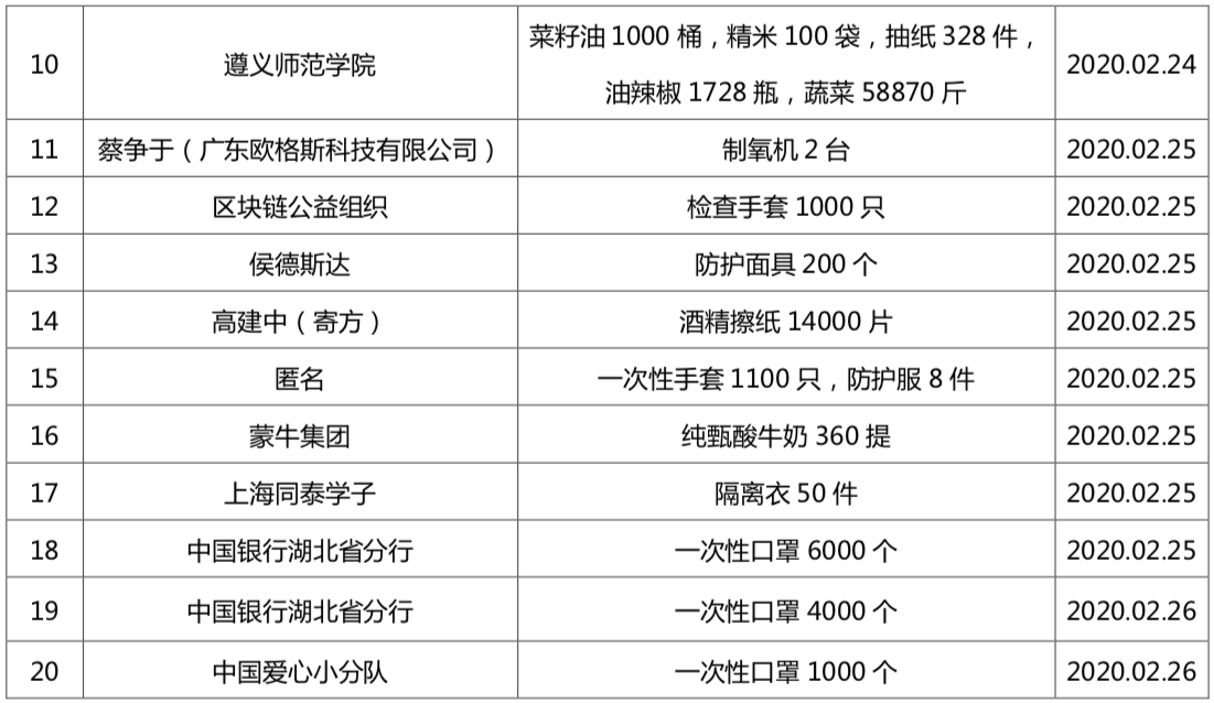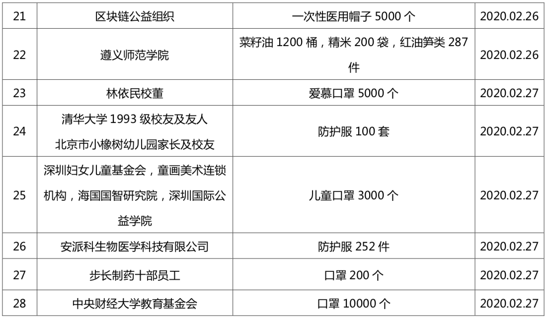 从2020年2月24日0时至2月29日24时,华中师范大学教育发展基金会共接收到的捐赠物资如下: